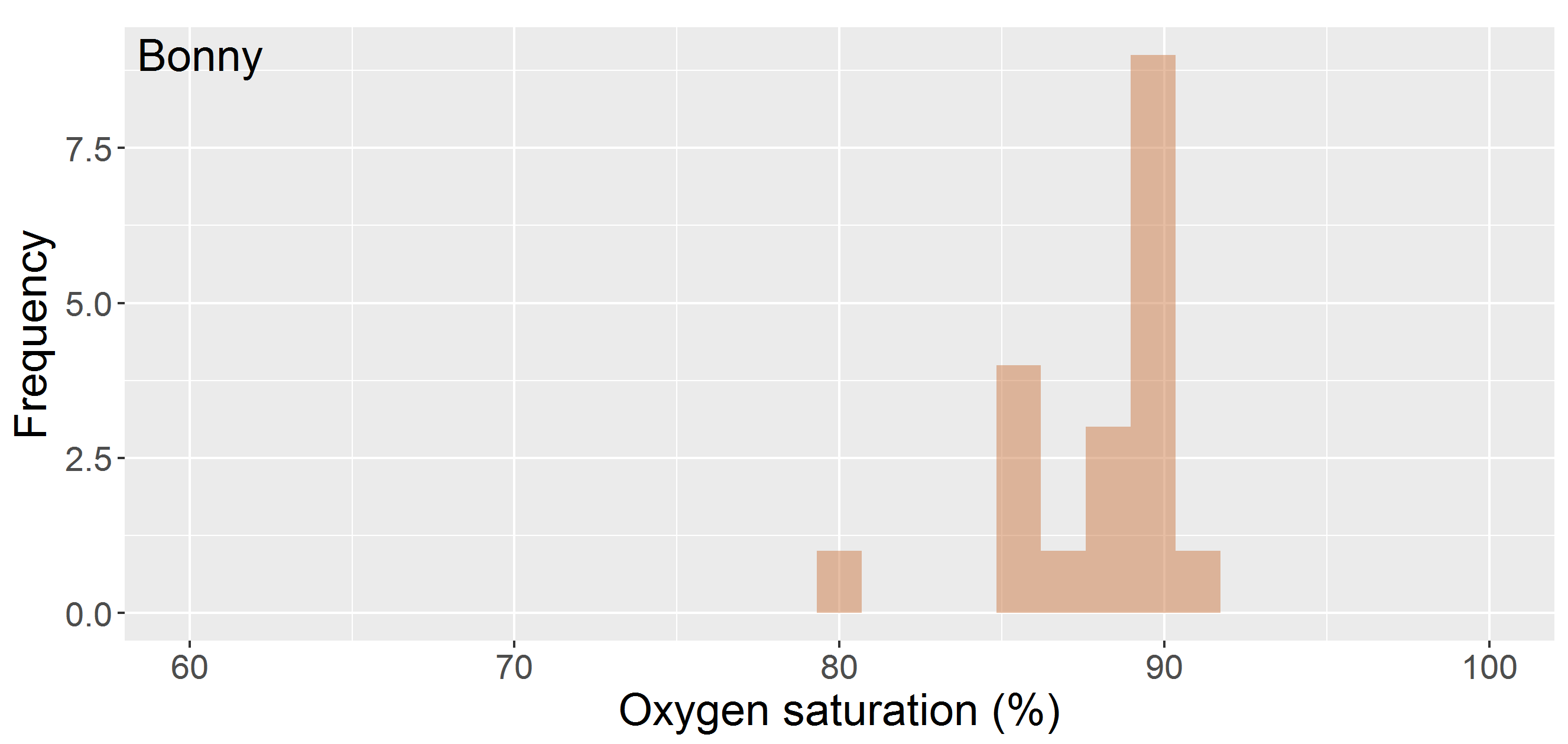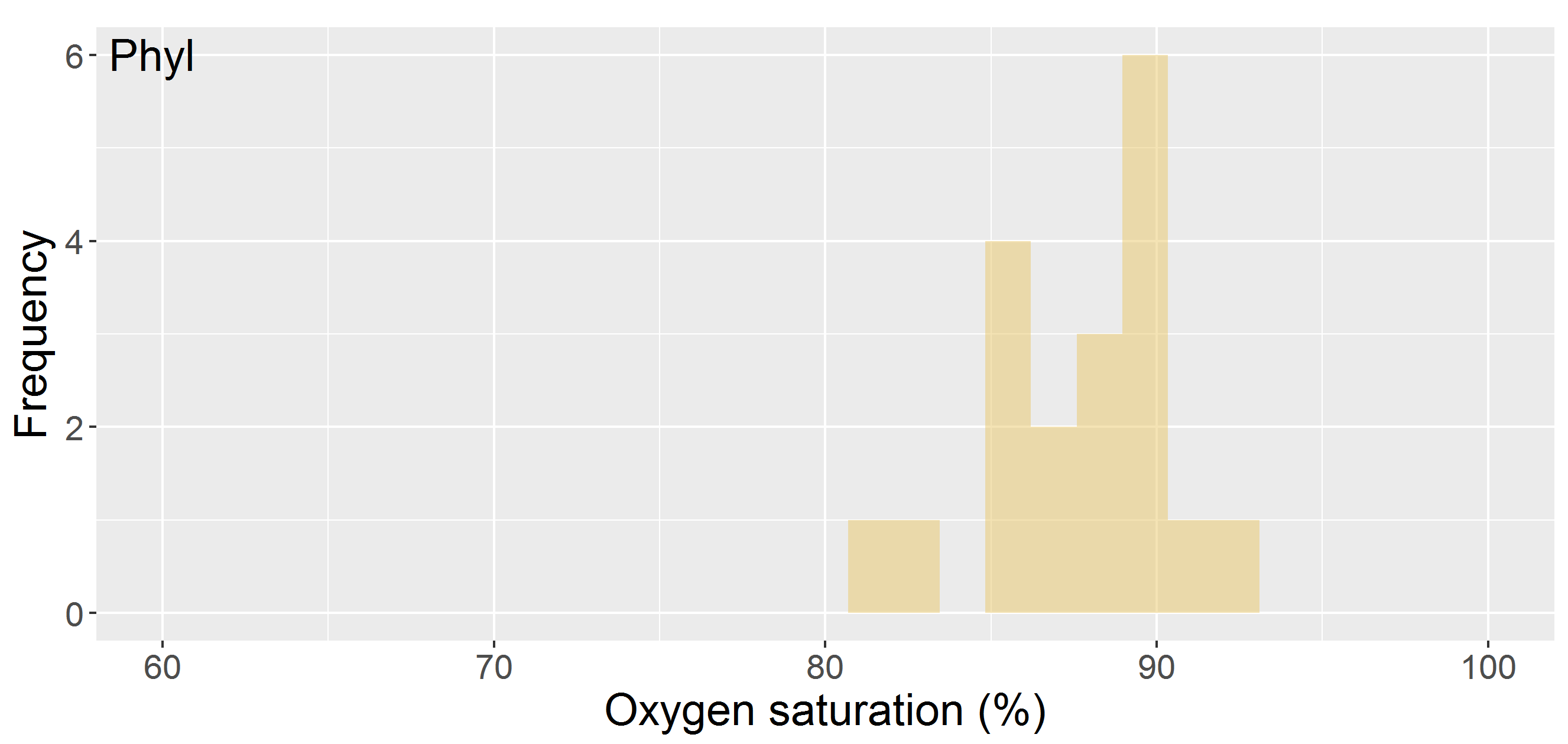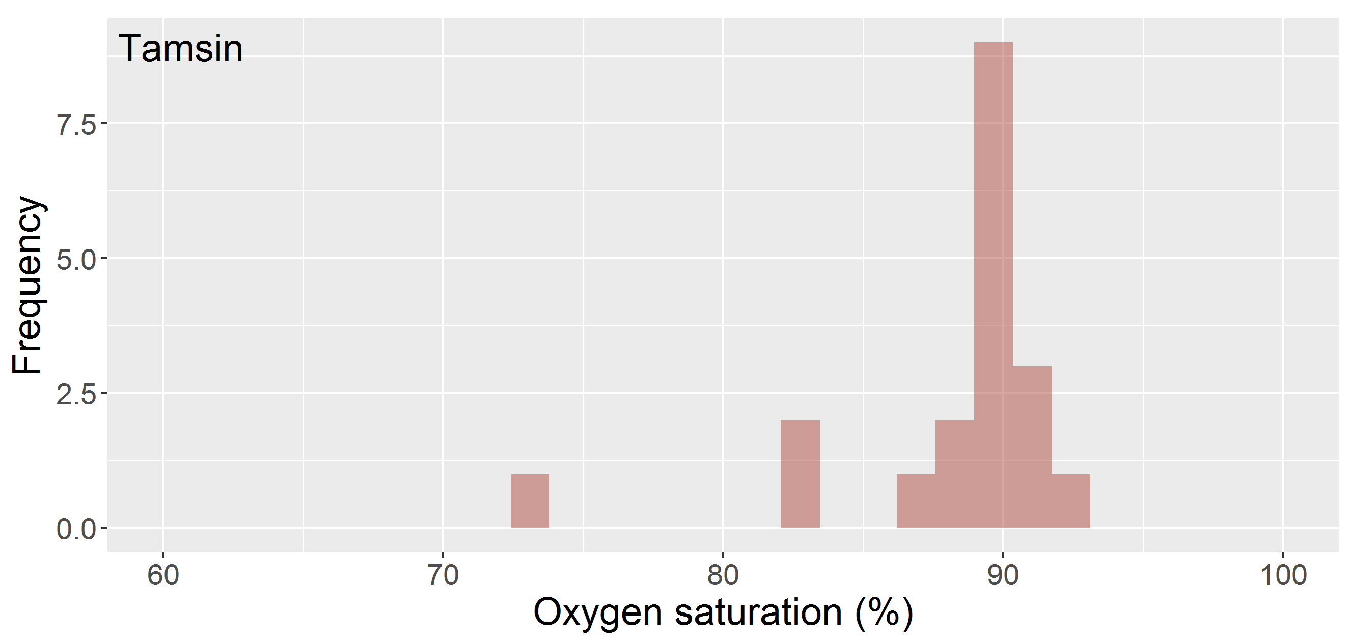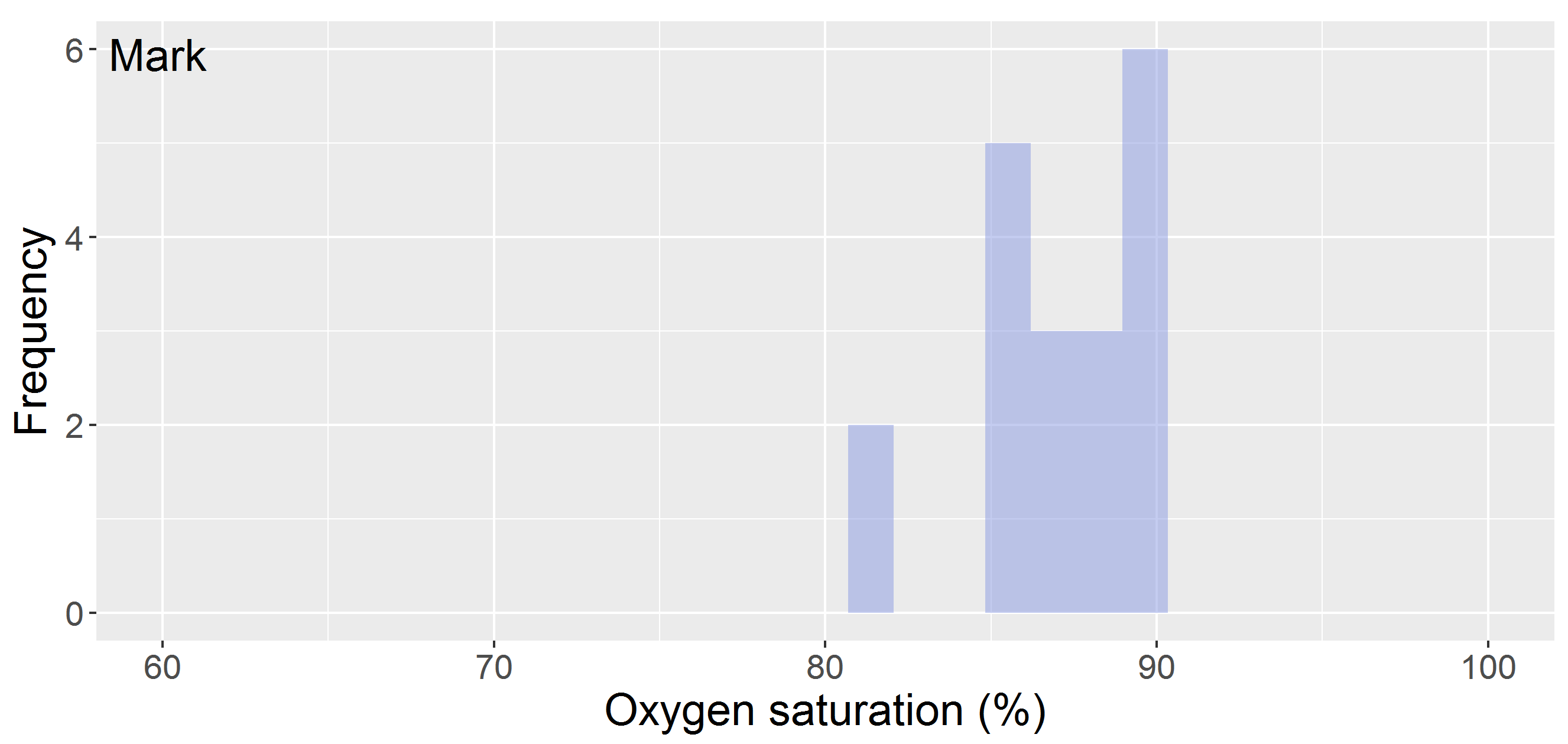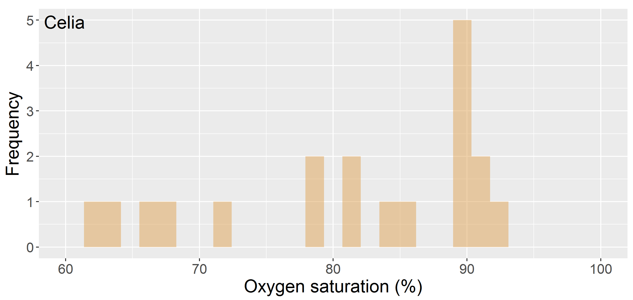 With our very limited data set, there is not a clear correlation between altitude and oxygen saturation. Age, nor gender, seems to bear a relationship on the ability to acclimatise. This conclusion is reinforced when one sees the dendrogram, (using Ward’s method), where the clustering was based on our individual distributions (see histograms). For example, Joe and Matthew, the two extremes of our age range, are deemed to have the most similar distributions. However, as one can see from the histograms, all the distributions are generally very similar, except for Celia. That is, generally, everyone’s saturation was above 80% with a regular measurement of around 90%. Celia, who felt poorly until she started taking Diamox, has the widest range of oxygen saturation. The difference she must have felt after taking Diamox is apparent from her time series.