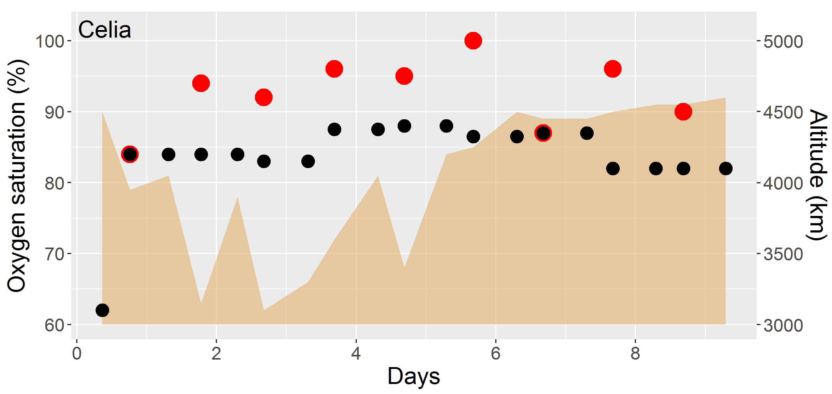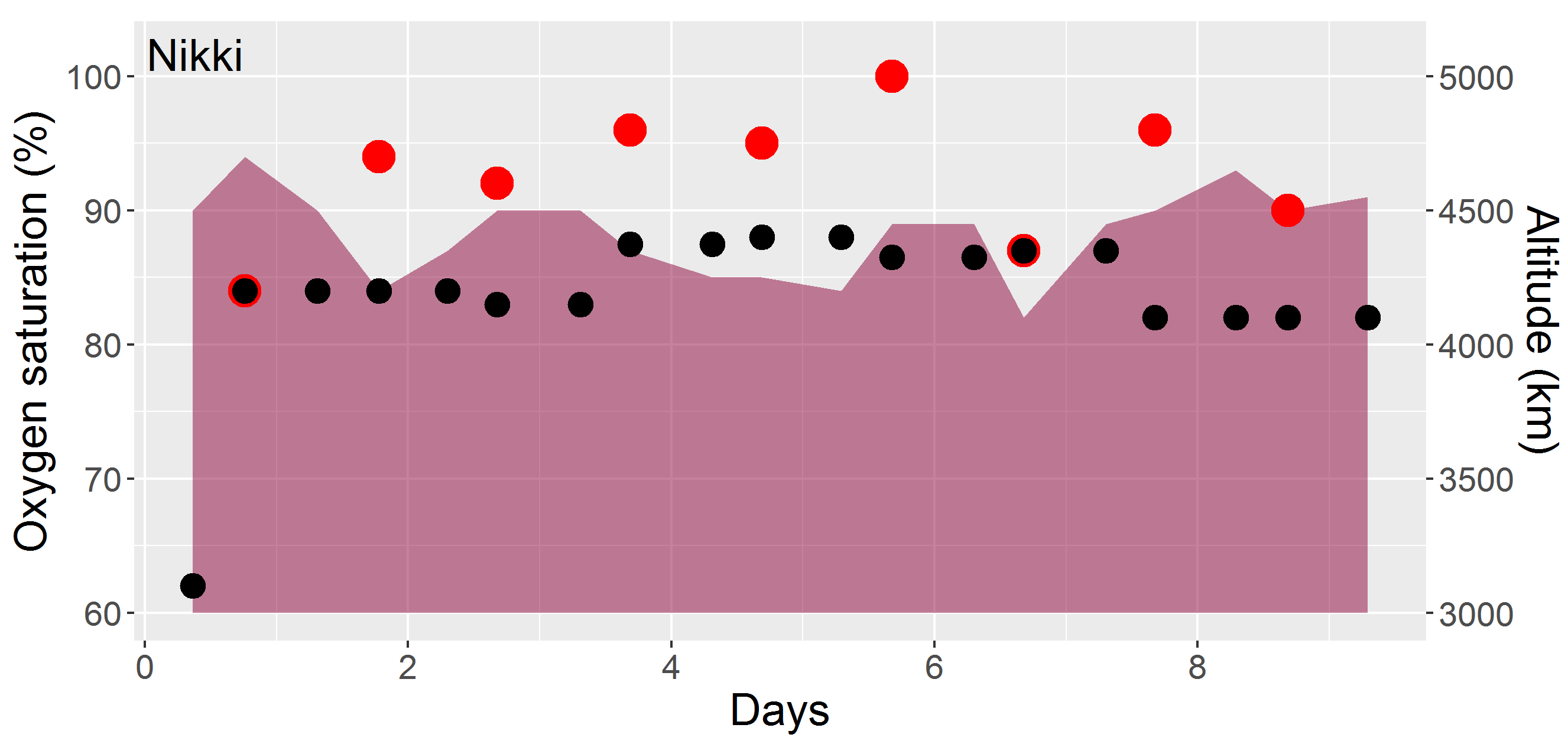 The altitude measure refers to the altitude we were at when measuring our oxygen saturation. When measuring the oxygen saturation in the evening, the highest altitude we reached that day was also recorded (the red circles in time series plots). We all completed the treks with smiles, although some more tired than others 🙂