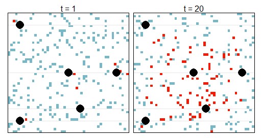 To demonstrate my project, consider a toy example in Square Land over 20 years. Within Square Land you have sampled infected people, at different locations and times, and identified whether they carry a resistant strain or not (like the WWARN data above). In addition, suppose you know the location of five treatment access points, such as health care centres or hospitals. The first and last year look like this.
